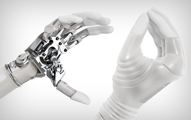 La prothèse ci-contre est la main Michelangelo, qui possède 5 doigts articulés et un poignet qui peut se bloquer sur des positions différentes.